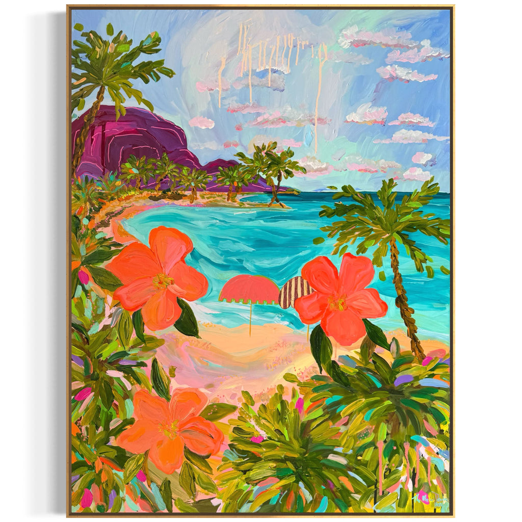 80x105cm approx including custom natural timber float framing. Mixed media on premium, deep edge gallery canvas. Please allow 3 weeks before your piece is ready to post.
